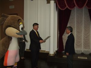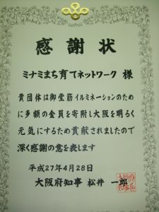 2015年4月28日(火)大阪府庁の正庁の間にて感謝状贈呈式がありました。昨年末から行われた御堂筋イルミネーションの「マイメッセージツリー」参加に対するものです。当会からは街づくり委員会境委員長が出席し、大阪府都市魅力創造局の岡本局長から感謝状をいただきました。
