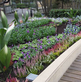 いつ行っても元気に木製遊具で遊ぶ子どもたちが来ています。ここにぽっかりと浮かんだ近未来的な素敵な芝生がありますが中には入れません。どうも屋上に植えられる芝生はとてもデリケートの様です。 可憐な花たちが美しいのが6階でした