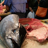 普段は商売人さんが対象の木津市場ですが、月に二度の朝市についてはわれわれ一般人もお買い物が楽しめます。市場に入ってみるとすでに多くの人で賑わっていました。私が子供のころ買い物は市場が中心で、威勢のよいおっちゃんの掛け声が思い出されます。子供たちも普段見ることもないさまざまな「切られていない魚」に興味津々です。おっとあそこではマグロの解体が行われています。マグロの大きさに感動!包丁捌きにも感動!おいしそうなトロにも感動!やっぱり市場は活気がありいいですね。